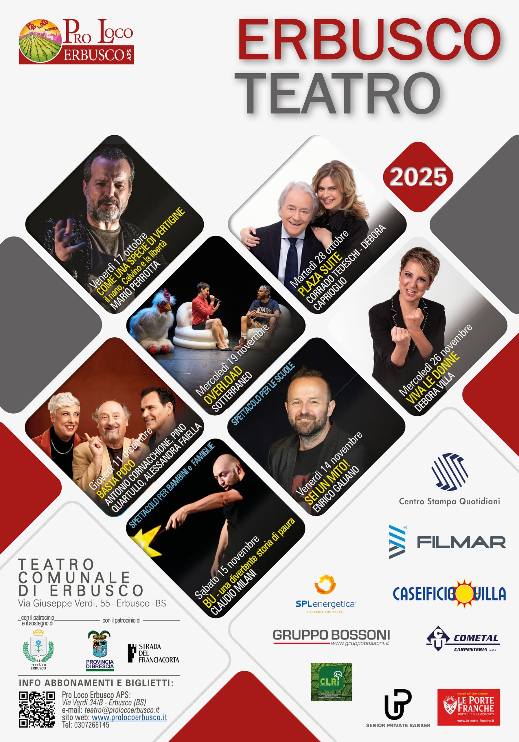 La Pro Loco Erbusco propone una ricca Stagione Teatrale che vede come protagonisti alcuni dei più famosi volti artistici del panorama attuale.